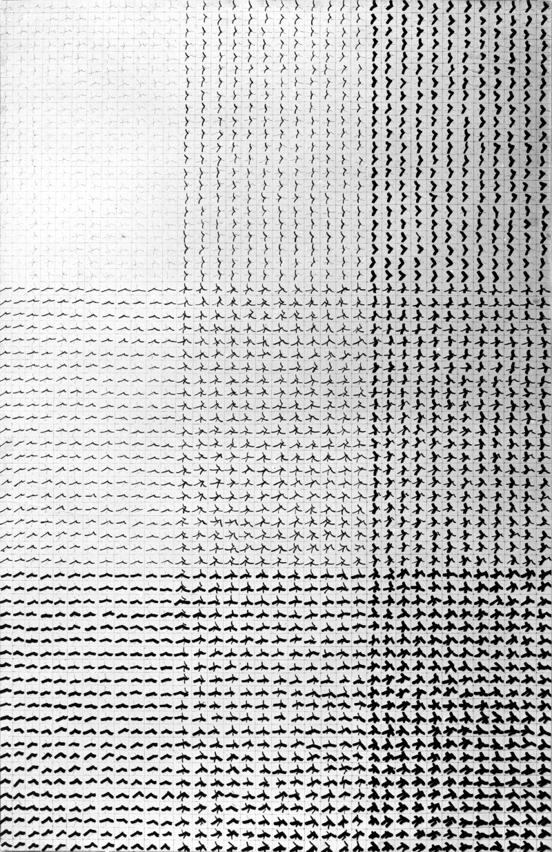 This intense pattern painted on a surface cannot be printed; its characteristic does not allow it interfere in any form in any space, material or illusory. It always exists independently, allowing the artist to combine individual images into one field and creating one large plane that can be multiplied endlessly by adding new components.